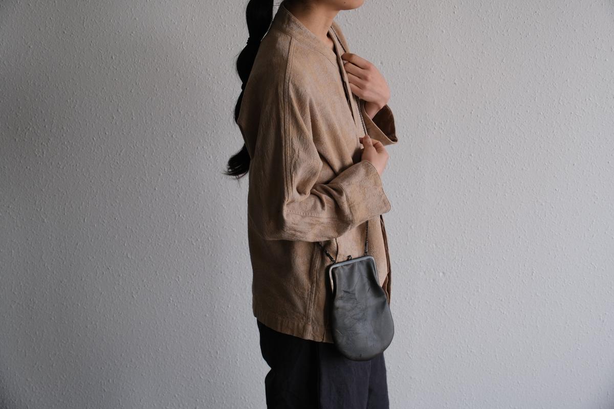 がまぐちタイプの口金フレームに、本体も定番的な形。ミニ財布としても、小物入れとしても使えます。付け外し可能な真鍮ロウ付けのチェーンのショルダー紐が付属しているので、首から掛けられます。