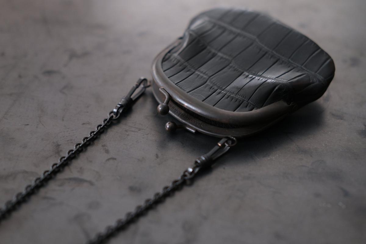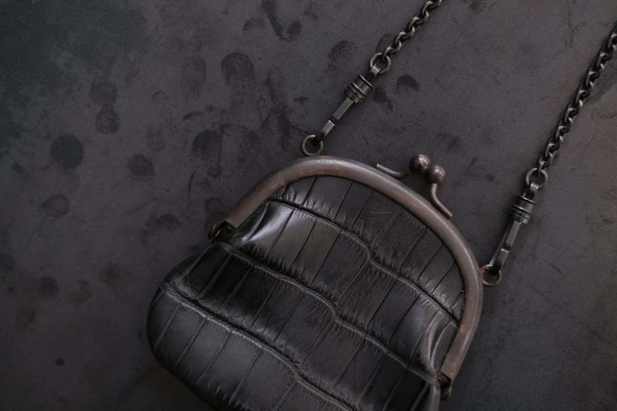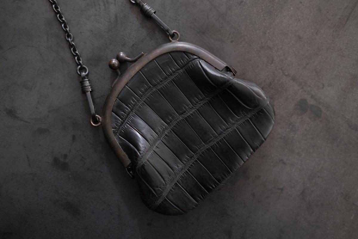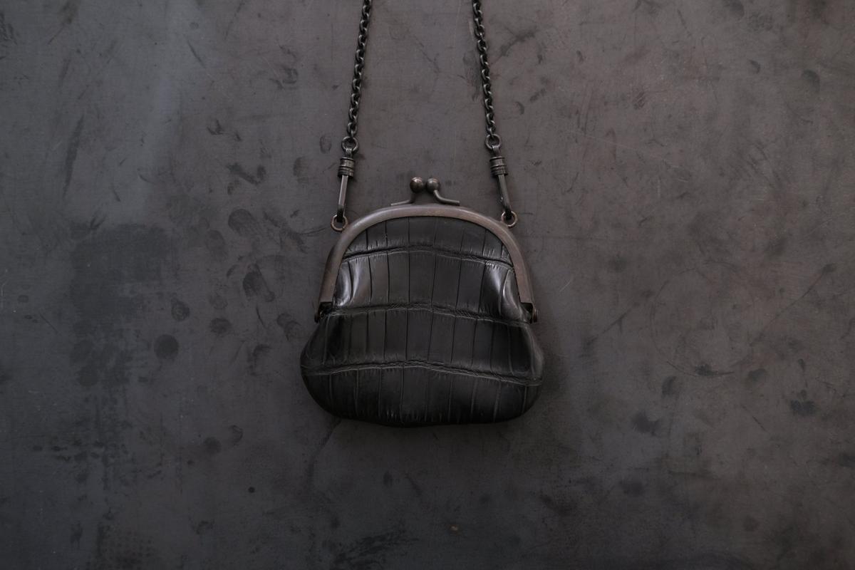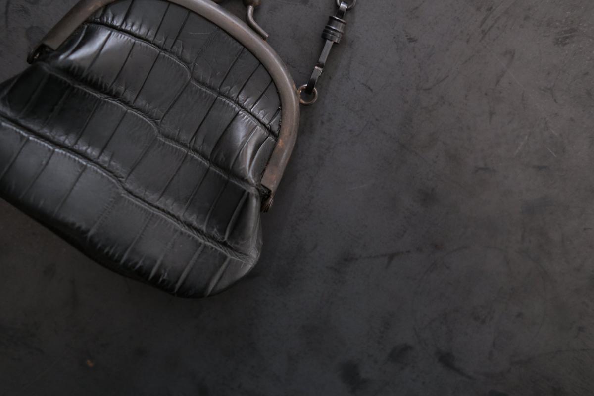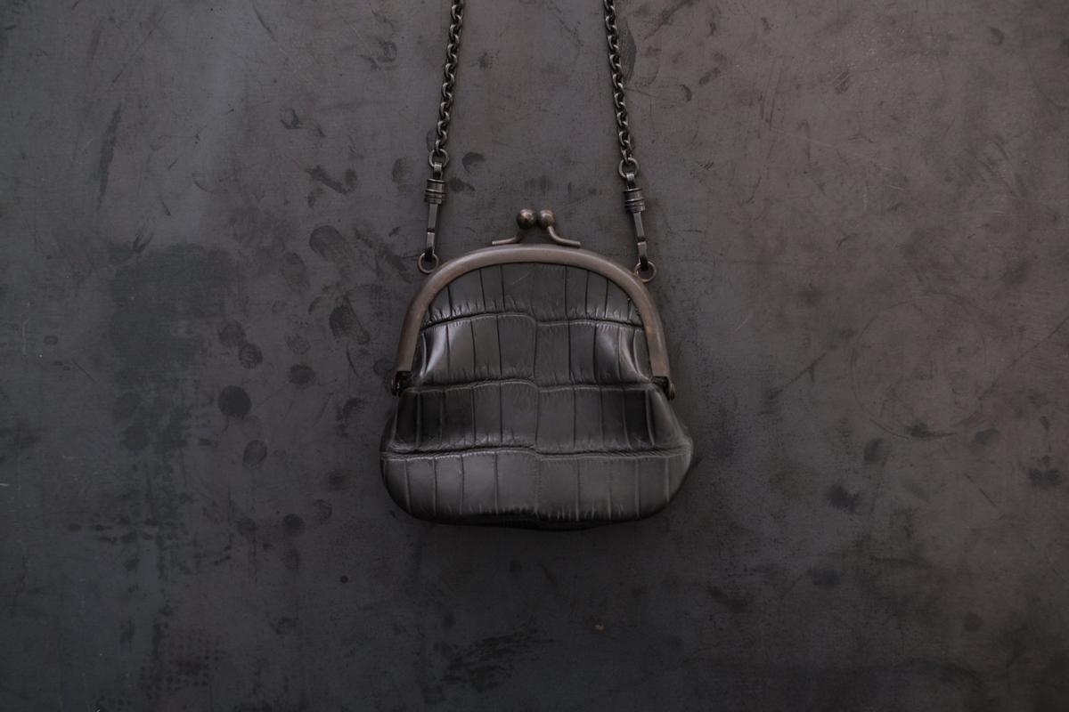 革は、高見澤さんは主に国内各地のジビエ(野生獣)の革を用いていますが、こちらはジビエ革ではなく、クロコダイルの革です。クロコダイルの皮を、タンニンで鞣し、染料染めしています。硬さと張りがあり、型押しではなくクロコダイル特有の天然の模様。大きな面積ですと迫力が出る革ですが、この口金とサイズとのバランスが良く、上品な印象です。