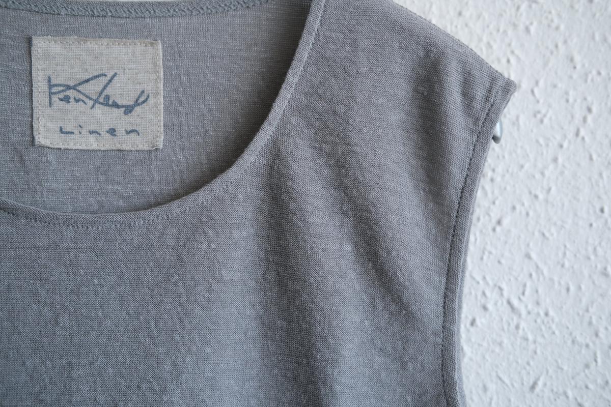 リネン80%、コットン20%のノースリーブのニット。商品名にはアンダーウェアとありますが、襟ぐりは空きすぎず、形も体の線を拾わない編み地と色、デザインパターンのため、カットソーとして着られる方も多いです。