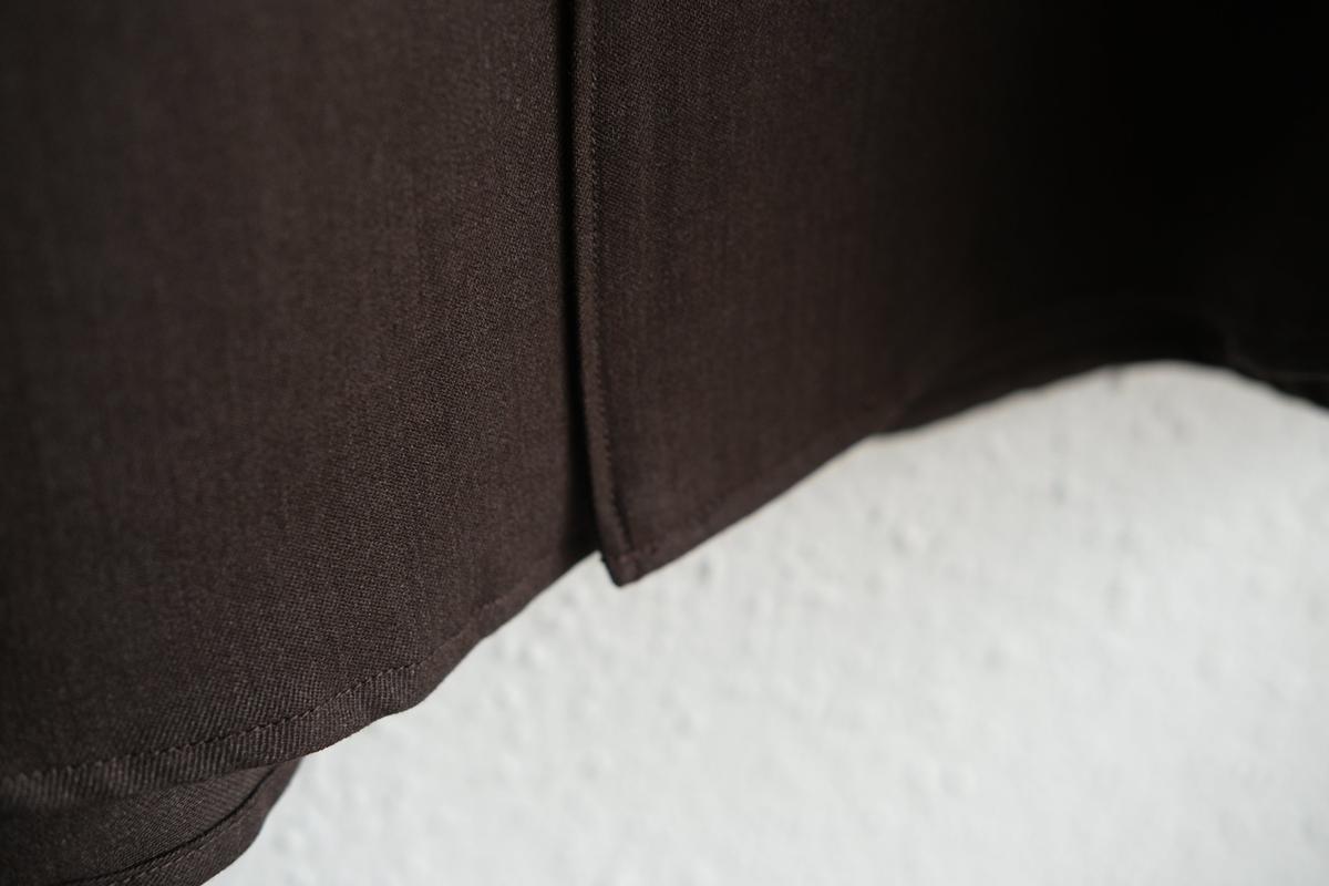 織りという組織、原料、撚糸加工、糸量や密度など織仕様のまさに"最適化"で、ウールの良さを引き立たせたシャツ。ウール100%ですが、いわゆるニットとは異なります。手触りは滑らかでつるっとした質感、ハリとコシがあります。ウール特有のとろみがあり、糸量もあるため綺麗なドレープが出ます。シワにはなりにくいのも嬉しいところ。素肌に着ても気持ち良いくらいの肌触りですが、インナーと合わせればシワにならず着られる上、ウールには防臭、消臭性もあり、洗濯頻度は少なく抑えられます。(下のリンクで洗濯方法をご案内しています)